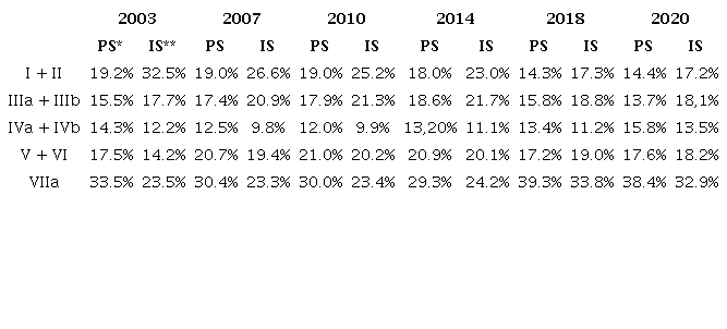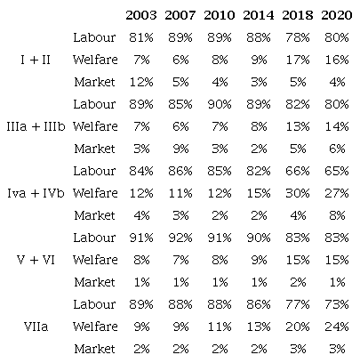 As observed in table 2, the share of the non-labour source from social security income is relatively low across all classes, even more so among households in the classes that are less well-positioned in the social structure. On the contrary, in times of economic downturn and crisis, the share of this source increases, particularly among households in the non-salaried classes, such as small proprietors or non-skilled classes, as the lowest in the social structure.