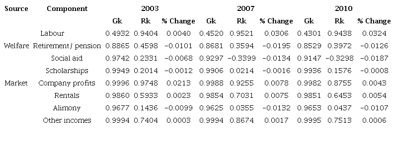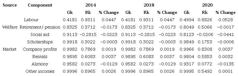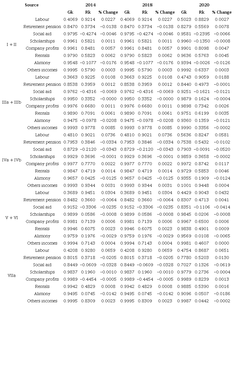 So far, the economic inequality of households in Argentina has been observed concerning the explanatory capacity of both the household social class and income sources. The elements (Gk) (internal inequality of each type of income) and (Rk) (correlation to total income) are presented below, together with an estimate of the impact that a marginal change in a particular income source will have on inequality. The analysis is carried out by disaggregating the components of each of the income sources to observe which ones affect the various sources within households of diverse social classes.