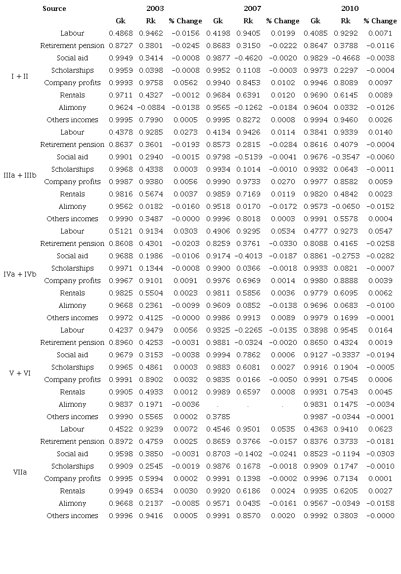 The last two tables present the decomposition of the Gini coefficient according to household social classes. The information in both tables is extensive, but we will summarise based on our aim.