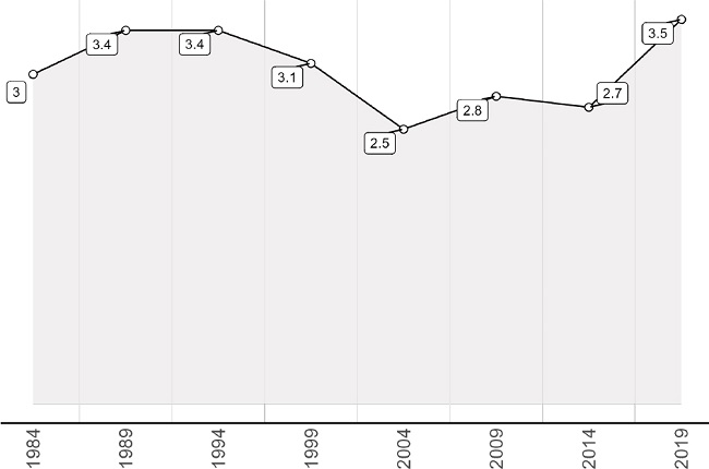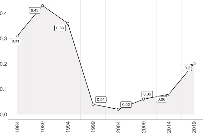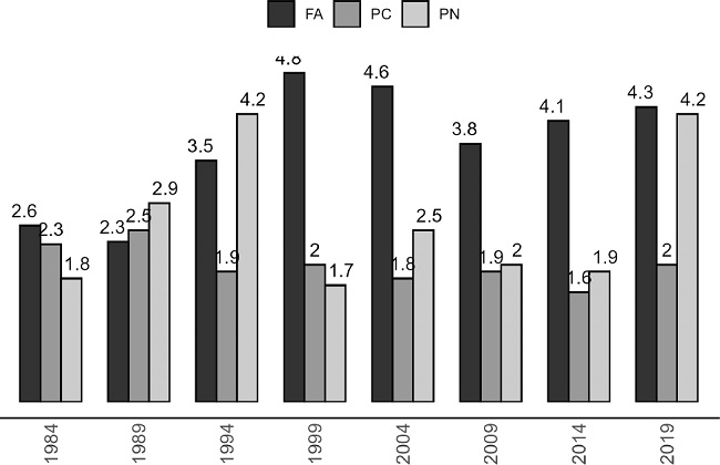 El Número Efectivo de Partidos (NEP) había caído en las elecciones de octubre de 2004 a 2,5 debido en gran medida a la caída del PC. En octubre de 2009 se situó en 2,8, en 2014 en 2,7 y en 2019 en 3,5, valor similar al observado entre 1989 y 1994.