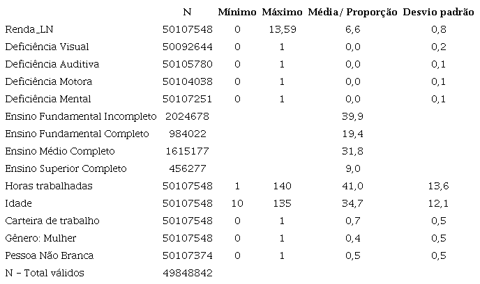 Com relação às variáveis explicativas, utilizou-se variáveis binárias, separadas para cada um dos quatro tipos básicos de deficiências identificados no questionário do censo 2010: visual, auditiva, motora e mental. Para os três primeiros tipos, o censo 2010 coletou informações acerca do grau ou severidade da deficiência, a saber: alguma dificuldade, grande dificuldade, ou não consegue de modo algum. Nesse trabalho, considerou-se apenas as deficiências severas, ou seja, indivíduos que informaram grande dificuldade ou não conseguir de modo algum. Essa escolha deve-se ao fato de que algumas deficiências de menor severidade serem imperceptíveis aos olhos dos empregadores e, dessa forma, não são alvo de discriminação. Já no caso de deficiência mental ou intelectual, o censo 2010 questiona apenas a existência ou não de tal deficiência. Dessa forma, todos os indivíduos que responderam sim a esse questionamento são considerados neste estudo. A análise descritiva dos dados revela que 2,43% dos trabalhadores(as) informam uma deficiência visual severa, 0,66% uma deficiência motora severa, 0,65% deficiência auditiva, e 0,34% relatam deficiência mental.