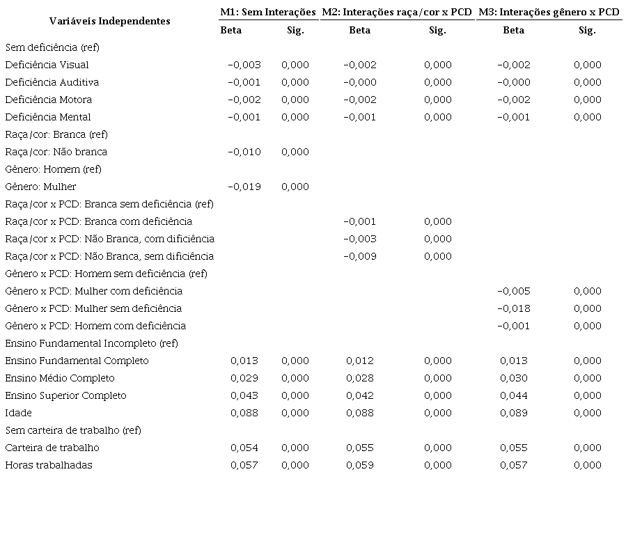Resultados parecidos foram encontrados no modelo 3, onde examinou-se a interação entre gênero e deficiência. Neste caso, temos como referência os trabalhadores homens, sem deficiência. Em relação a estes, as mulheres sem deficiência são aquelas que se encontram no pior estrato, seguidas pelas mulheres com deficiência e, por último, temos os homens com deficiência. Os resultados dos modelos 2 e 3 revelam, de uma forma geral, uma maior potência discriminatória das categorias raça/cor e gênero em relação às pessoas com deficiência. Uma possível interpretação desse resultado é, por contemplar um universo de pessoas inseridas no mercado formal de trabalho, as normativas que desde a década de 1990 determinam a formulação de políticas públicas que garantem a entrada de PCD nas empresas, já apresentem hoje um efeito direto na discriminação dessas pessoas no mercado de trabalho.