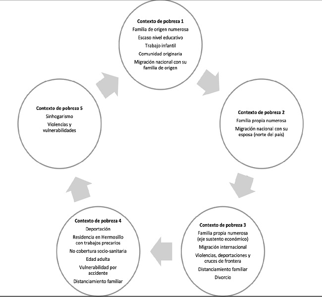 Ramón ha tenido presente durante toda su vida que el trabajo y el esfuerzo eran básicos para seguir adelante, implicando sobrevivir y no progresar. La trayectoria vital de Ramón ha mostrado una movilidad descendente (de PE familiar al sinhogarismo), entendiendo ésta a partir de la suma de vulnerabilidades en distintos contextos de pobreza ( esquema 1), que han obstaculizado alcanzar una mejor calidad de vida en su entorno.