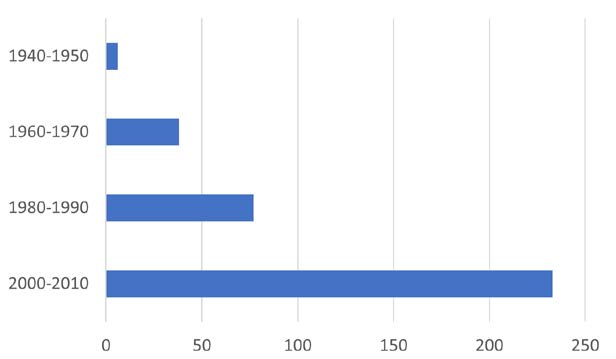 Apesar das dificuldades encontradas nos meses de pesquisa em banco de dados, foi possível mapear aqui os cursos de jornalismo situados nas metrópoles, nas cidades médias e em cidades pequenas. Os resultados mostram que a maioria dos cursos se localiza em cidades médias, seguidas dos grandes centros 38 . Sua expansão foi mais intensa entre as décadas 1990 e 2010, mas os anos 1970 mostram crescimento razoável para a época, com o estabelecimento de 27 cursos em todo o território nacional. Condições históricas, geográficas e culturais contribuíram para a conjuntura em que os cursos foram criados, como se depreende da análise das políticas de governo para o ensino superior ao longo de várias décadas.