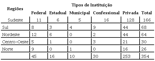 Os cursos de jornalismo em universidades públicas, privadas e comunitárias são credenciados de acordo com o Art. 19 da Lei de Diretrizes e Bases da Educação (Lei nº 9.394/1996). Nos 415 registros encontrados no sistema e-MEC 24 , filtros com as palavras-chave “curso de Jornalismo”, “ensino presencial” e “em atividade” eliminaram registros em duplicidade (24), cursos extintos (47) e não iniciados (37). Com isso, identificamos 354 cursos de jornalismo em 315 instituições localizadas nas regiões Sudeste (166), Sul (68), Nordeste (64), Centro-Oeste (30) e Norte (26). Os cursos estão principalmente em instituições privadas (253) e o restante se distribui entre universidades federais (45), confessionais (30), estaduais (16) e municipais (10), como mostram os dados da Tabela 1 .