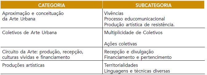 As categorias e subcategorias organizadas nos proporcionam apresentar uma estrutura de análise que possibilite compreender como os Movimentos Artísticos Urbanos venezuelanos comunicam suas proposições. Assim, na categoria “Aproximação e conceituação da Arte Urbana”, temos três subcategorias: Vivências, na qual buscamos trazer um pouco da experiência dos artistas e da forma como aproximaram-se da Arte Urbana. Neste momento, buscamos entender como os sujeitos individuais se associam a um coletivo.