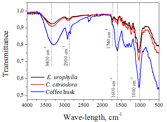 The 1740 cm-1 band in C. citriodora and E. urophylla spectra corresponds to the C=O axial stretching (carbonyl group) (IBRAHIM et al., 2010). In the coffee husk spectrum, the 1600 cm-1 band seems to have higher intensity and may be related to the C=C bond of aromatic groups (COUTO et al., 2012). This fact corroborates with the results presented in Table 2, where a high lignin level was reported for coffee husks, affecting this band intensity.