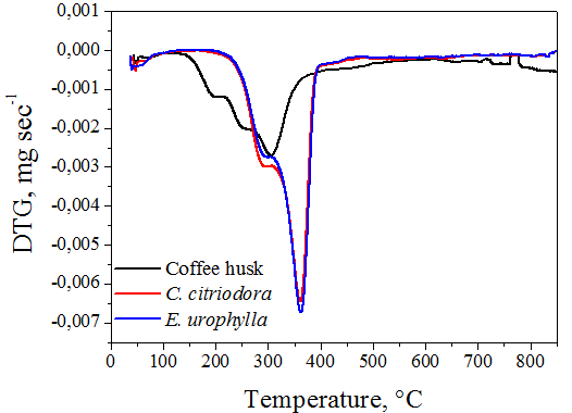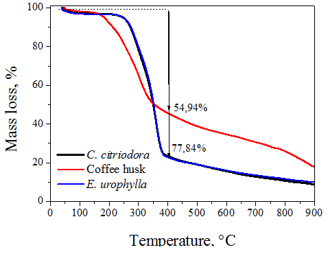 Thermograms of C. citriodora and E. urophylla woods are similar, and different from that of coffee husk, which showed higher thermal stability, due to higher lignin content.