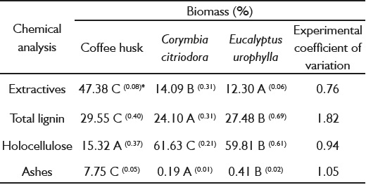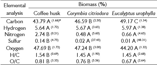 The mean content obtained by biomass elemental analyses is shown in Table 3. C. citriodora and E. urophylla wood showed higher carbon content when compared to coffee husk. Eucalyptus urophylla had higher carbon content. The oxygen content of C. citriodora and E. urophylla is close to that of the coffee husk. The hydrogen content was statistically the same for all evaluated biomasses. C. citriodora and E. urophylla showed less nitrogen and sulfur content.