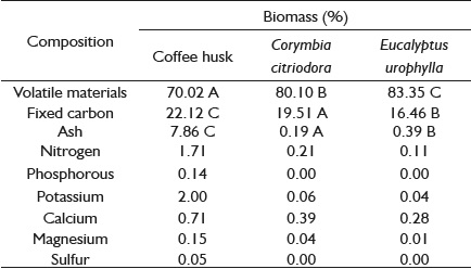 The mean values of volatile materials, ash and fixed carbon of biomasses, as well as the percentage of nutrients are showed in Table 4. The coffee husk presented much higher nitrogen, phosphorus, potassium, calcium, magnesium and sulfur values than the woods of C. citriodora and E. urophylla, which will certainly contribute to the formation of biochar with better physical and chemical characteristics, and consequently, greater use potential.