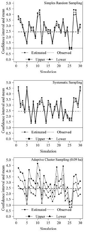 Using the Morisita index (IMi), it was verified that 27 of the 30 simulations of SRS and SS presented values of the index statistically higher than 1.0, configuring an aggregated spatial pattern. Of the three cases where there was no aggregate distribution for SRS and SS, two were unable to estimate a value for the index, which occurred when the sampling process recorded only one tree in all samples, and one resulted in IMi equal to zero, caused by the same abundance of trees in the sample units in which andiroba was present (Amaral et al., 2015). On the other hand, in the ACS all the simulations resulted in an aggregate spatial distribution. Thus, it can be stated that the pattern obtained by the 100% inventory is similar to that described by the sampling procedures.