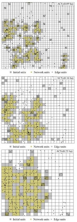 With the reduction of the initial unit for 0.09 and 0.16 ha, the same cluster formed smaller networks, resulting in a much smaller final sample area (Figure 2). In these cases, the adoption of values for C > 1.0 would lead to non-clustering, because only 3.24 and 8.96% of the N units available in the area to 0.09 and 0.16 ha, respectively, presented more than one tree. It was also observed that for the same inclusion condition there was little variation in the number of trees and weights of the networks among the three sample unit sizes, which caused little discrepancy in the mean, because the networks that presented many individuals also had many networks. Thus, in the calculation of the mean estimator, the weight will be used once for each unit of the initial sample (Bruzinga et al., 2014), so the probability of larger networks having more than one of their selected plots in the initial sample is greater than in the smaller network plots.