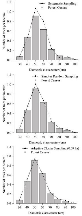Based on the diameter information, the diametric structures were calculated for the SRS, SS, ACS (0.09 ha) and 100% inventory, obtained by calculating the trees in diametric classes with a 10 cm amplitude, after the inclusion of the tree diameters. In this case, the number of trees per diameter class was obtained by means of the average of 30 simulations. The Kolmogorov-Smirnov test (K-S) was used to evaluate significant differences between the 100% inventory diameter structure and those obtained from SRS, SS and ACS processes (0.09 ha), at 95% of probability.