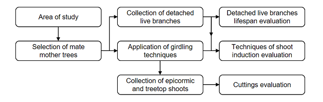 The four techniques of reinvigoration and rescue of vegetal material consisted of: complete girdling (100%); semi-girdling (50%); collection of detached live branches; collection of shoots from the treetop (canopy). The treatment of treetop shoots was considered as a control in the rooting of cuttings due to their high availability of material. Therefore, for the statistical evaluation of this experiment, only the first three treatments were considered.