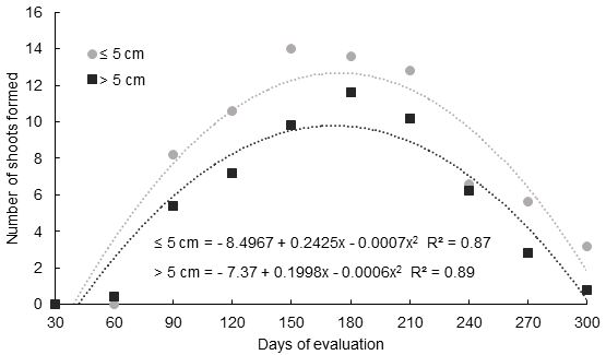 The experiment was conducted in a completely randomized design, with six replicates of one branch for each treatment. The treatments were determined in: branches smaller or with a diameter equal to 5 cm, and; branches larger than 5 cm in diameter. The development of shoots in the branches was evaluated in the form of regression, relating the periods of evaluation and the diameter of branches. Evaluations began 30 days after implantation, occurring every 30 days, with 10 evaluations, from September 2016 to June 2017 (300 days).