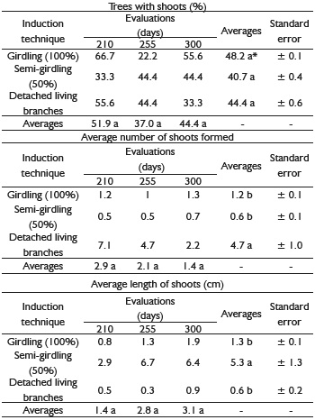 The evaluation periods were not significant; the results of the variables are not related to the evaluation periods. The percentage of shooting trees remained between 37.0% and 51.9%, the average number of shoots formed between 1.4 and 2.9, and the average length of shoots between 1.4 cm and 3.1 cm.