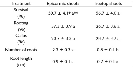 Comparing the rooting from cuttings of epicormic shoots and treetop, no statistical differences were detected for the variables of survival, rooting, callus formation and average root length. Only observed differences occurred for the average number of roots formed (Table 2).