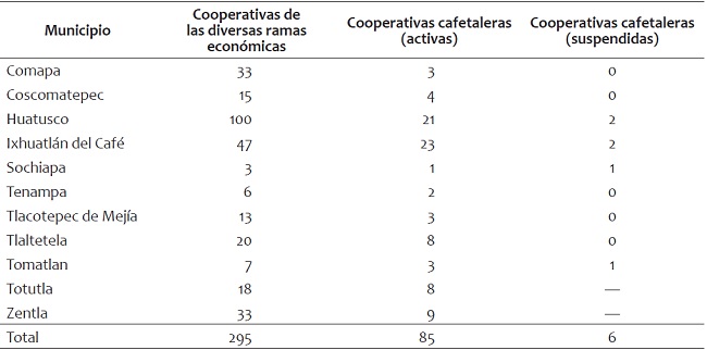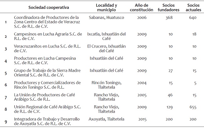 Medina y Flores (2015), con base en datos del Directorio Estadístico Nacional de Unidades Económicas del Instituto Nacional de Estadística y Geografía (INEGI), calcularon que en 2015 había en México un total de 13 041 cooperativas, de las cuales 682 tenían sede en Veracruz, siendo el sexto estado con más asociaciones de este tipo a nivel nacional (el 5.2% del total). Por su parte, el Servicio de Administración Tributaria reportaba que en 2016 en la región de Huatusco operaban 295 cooperativas dedicadas a diversos ramos (SAT, 2016); tal cifra representaba el 2.2% del total de este tipo de asociaciones a nivel nacional y el 43.2% a escala estatal. El propio SAT consignaba que 91 de esas organizaciones se dedicaban al cultivo del café, aunque seis de ellas suspendieron sus actividades en fecha reciente.