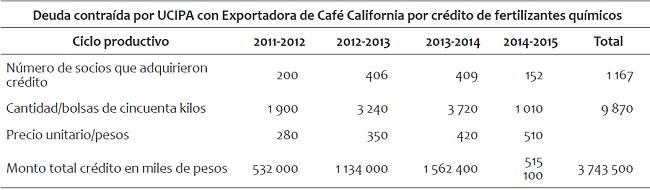En 2014, por cada paquete se incluyó un crédito en efectivo de 2100 pesos para pago de jornales, de manera que quienes solicitaron cuatro paquetes contrajeron una deuda de 44 000 pesos, y en 2015 un pasivo de casi 40 000 pesos. En suma, en estos dos años la deuda de los productores de UCIPA con Café California fue de casi nueve millones de pesos, una cantidad exorbitante si se considera la escala de la economía campesina y la crisis en la que se encuentra. Sin embargo, esto fue utilizado por Café California para gestionar recursos económicos ante instituciones gubernamentales a nombre de la organización, de manera que en marzo de 2016 el INAES depositó en la cuenta de UCIPA 6 728 000 pesos por la adquisición de 772 “paquetes tecnológicos” a Café California en el año de 2015, de los cuales sólo 408 correspondían a la organización; el resto eran créditos de otros campesinos de la región.39 Desde luego, el dinero no llegó a manos de los productores y pasó directamente a la cuenta bancaria de la empresa.