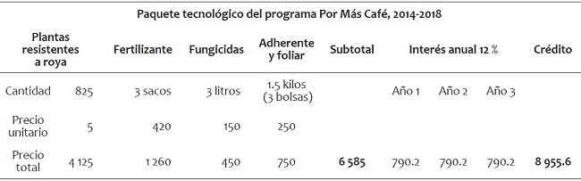 El paquete está calculado para renovar un cuarto de hectárea y su precio a crédito en 2014 era de 9000 pesos, incluyendo el 1% de interés mensual para pagarse en cuatro años. En 2015 el crédito ascendió a 9700 pesos debido al incremento del precio de los insumos químicos. De acuerdo con la directiva de UCIPA, “en el año 2014, 315 productores adquirieron 408 paquetes tecnológicos, y en 2015, 347 productores adquirieron 463 paquetes” (UCIPA, 2015). La mayoría de las familias compró un paquete o dos, pocas se atrevieron a pedir cuatro para renovar una hectárea de cafetal.