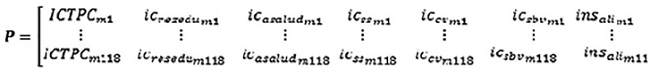 El bienestar se mide a partir de la variable “ingreso”, representada con el monto promedio de ingresos por hogar en cada municipio. Los derechos sociales se miden con seis variables: servicios básicos, calidad y espacios de la vivienda, alimentación, educación, salud y seguridad social, indicándose el porcentaje de hogares sin acceso a cada una de estas variables. La base de datos se representó de forma matricial en el programa Excel, con 118 municipios como filas y siete variables como columnas. La expresión matemática de la matriz de pobreza (P) es la siguiente: