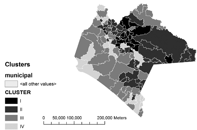 Esta matriz se exportó al programa Infostat para proceder con el análisis cluster. Se eligió este tipo de análisis como método estadístico multivariado partiendo de las siguientes premisas: que cada municipio perteneciera a un solo grupo, que todo municipio quedara clasificado y que cada grupo fuera internamente homogéneo, en otras palabras, que se lograra maximizar la varianza inter-grupos y minimizar la varianza dentro de los grupos (Peña, 2002; Montanero, 2008). Se eligió el principio de aglomeración no jerárquico K-means y distancia euclidea al cuadrado, y se dio la instrucción de estandarizar los datos debido a que la variable “ingreso” se encontraba en números absolutos y el resto en relativos. Considerando la importancia de la validación de los resultados como etapa final en la elaboración de conglomerados (Aldenderfer y Blashfield, 1984), los resultados del agrupamiento se validaron por medio del “análisis discriminante” y se renombraron para formar la tipología como municipios de perfiles I, II, III y IV.