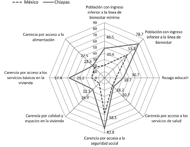 A partir de esta metodología, las estadísticas más recientes reflejan que en México el 46.2% de la población es pobre multidimensional y el 9.5% se encuentra en pobreza multidimensional extrema. La situación es mucho más grave en Chiapas que en cualquier otra entidad porque en este estado el 77% de la población se encuentra en pobreza multidimensional y el 28% en pobreza multidimensional extrema; además de ello, la tendencia es creciente en los últimos años (CONEVAL, 2017). La incidencia muestra que la pobreza extrema en Chiapas triplica la media nacional.