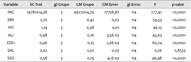 Ahora bien, a pesar del nivel generalizado de pobreza en la entidad, Chiapas puede dividirse en cuatro conglomerados que se consideran adecuados para distinguir intensidades de pobreza y prioridades de política pública a nivel municipal (ver Tabla 3 y Mapa 1). La clasificación obtenida con el análisis cluster se sometió a otra técnica multivariada, el análisis discriminante, con la finalidad de minimizar la probabilidad de equivocarse en la asignación de municipios para cada perfil. El análisis de varianza univariado y la prueba de homogeneidad de matrices de covarianzas valida la tipología definitiva, lo que permite la máxima heterogeneidad entre grupos y homogeneidad al interior (ver Tablas 1y2).