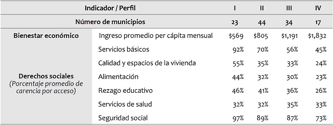 En un comparativo inicial entre perfiles, la dimensión de bienestar muestra que el perfil más bajo presenta un nivel de ingresos que ni siquiera es suficiente para adquirir una canasta alimentaria rural, considerando el precio de la misma al momento del levantamiento de información del MCS-ENIGH 2010. A medida que aumenta el perfil disminuyen las condiciones de pobreza, pero también cambian las características de la misma tanto por las variables que la determinan, como por el contexto geográfico, económico y cultural de los municipios (ver Tabla 3). A continuación se presentan las particularidades, prioridades y propuestas diferenciadas para cada uno de los conglomerados.