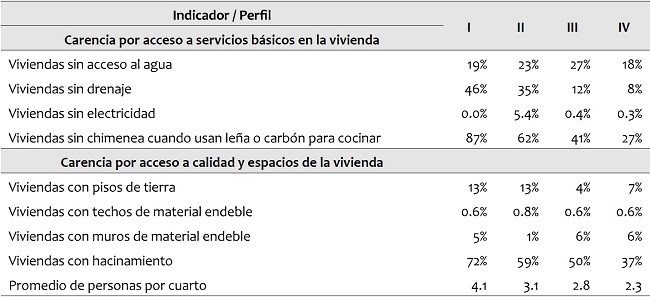 La situación de pobreza extrema se refleja en las viviendas, pues más del 90% carece de servicios básicos (ver Tabla 4) debido a que en la gran mayoría se cocina con leña o carbón sin chimenea, y alrededor de la mitad carece de drenaje. A partir de la información de la ENIGH se observa también que siete de cada diez viviendas presentan hacinamiento, con un promedio de cuatro personas por dormitorio.