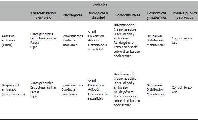 Se utilizó un corte mixto a partir de la construcción de un instrumento único que consistió en una encuesta semiestructurada aplicada en escuelas, centros de salud, instituciones de gobierno y domicilios particulares. En dicho instrumento se exploraron las siguientes variables: estructura familiar y relaciones interpersonales, conocimiento sobre sexualidad, prácticas sexuales y uso de métodos anticonceptivos, vida cotidiana, autoestima y plan de vida, percepciones sobre ser mujer y embarazo, así como políticas públicas y servicios; a su vez, y de manera transversal, se cruzaron dichas variables por dos dimensiones dadas a partir de la condición de embarazo en adolescentes: antes y después del embarazo, que se traducen en las causas y los efectos del mismo y de las cuales se describen algunas en el presente artículo (ver Tabla 1).