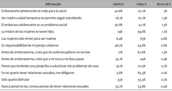 Las mujeres quintanarroenses encuestadas, que vivieron un embarazo durante su adolescencia, expresaron varias ideas en torno al tema. Una opinión reiterada fue que vivir un embarazo siendo adolescente (ver Tabla 2) no es malo para la salud; que ser madre a edad temprana no dificulta continuar estudiando, y que no se trata de un problema social. Sin embargo, cuando se les entrevistó respecto a su proyecto de vida, mencionaron que no contemplaban embarazarse a edad temprana y sí visualizaban las consecuencias de tener relaciones sexuales. También mencionaron expresiones como: “nadie te obliga a tener relaciones sexuales”, y la mayoría expresó que ellas mismas las aceptaban durante su adolescencia y que sabían que el uso de anticonceptivos era la mejor forma de prevenir el embarazo; a pesar de ello, no los utilizaron.