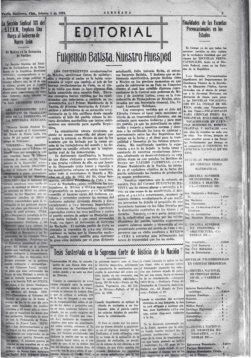 El editorial se encuadra en la presidencia de Lázaro Cárdenas y ofrece referencias de interés analítico para establecer las relaciones entre Cuba y México, mediadas en el texto gracias a la primera visita oficial de Fulgencio Batista. Unas relaciones ratificadas por el país caribeño al concedérseles a los generales Lázaro Cárdenas y Manuel Ávila Camacho la Gran Cruz “Carlos Manuel de Céspedes” y la Orden del Mérito Militar; mientras que Fulgencio Batista fue condecorado con el Collar del Águila Azteca, máxima distinción concedida a un extranjero por México (Herrera, 2014:148). Diplomáticos y políticos surgidos del hecho revolucionario mexicano no tuvieron ninguna duda en reflejar su “apoyo y comprensión” a la figura de Fulgencio Batista; con más razón sabiendo que la llegada al poder de los militares, encabezados por el sargento taquígrafo Batista, tenía en la Revolución mexicana un referente por su sello nacionalista y antiimperialista. Este sello, junto a la omnipresencia de José Martí, influyó en los movimientos estudiantiles y obreros que se convertirían en presencia imborrable hasta la Revolución cubana (López Portillo, 2005:136). Obreros que iniciaban su organización, con el beneplácito oficial, y la indudable participación del mexicano Vicente Lombardo Toledano (López Portillo, 2005:138), como se demostró en el Congreso Obrero Latinoamericano de la década de los treinta del pasado siglo, destinado a lograr la unidad de los obreros del continente (Herrera, 2014:72), y donde la delegación cubana mostró su interés por cohesionar su disperso movimiento obrero (Herrera, 2014:141-142).
