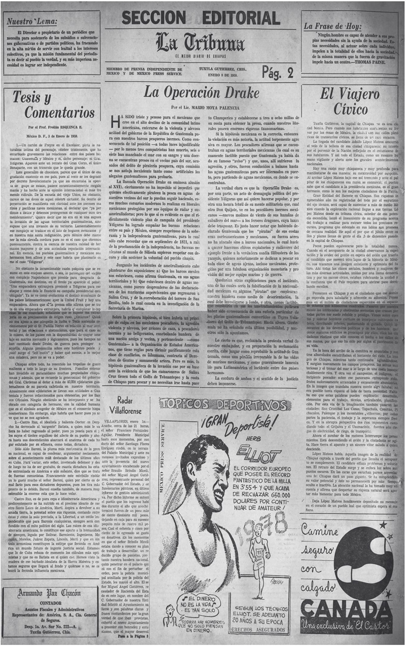 Froilán Esquinca E(squinca),6 quien firma la columna “Tesis y Comentarios”, además de contrarrestar las figuras de Batista y Castro con abundante uso de adjetivos para loar al segundo, hace del movimiento revolucionario cubano un escalón más de las propuestas transformadoras latinoamericanas, por ello aparecen nombres tan dispares como Simón Bolívar, José Ingenieros o Emiliano Zapata. Así, el “idealista” Fidel Castro se convierte en un escalón más de tal imaginación de futuro con la “fecunda influencia mexicana”. Al mismo tiempo sobresale la referencia al periodista italiano Aldo Baroni, alguien que vivió en Cuba durante la dictadura machadista y quien con posterioridad, desde las páginas del periódico Excélsior, fue un constante crítico de la Revolución cubana (Reynaga, 2007:43), algo considerado por Esquinca como lógico por ser la “pluma más mercenaria de la prensa nacional”.