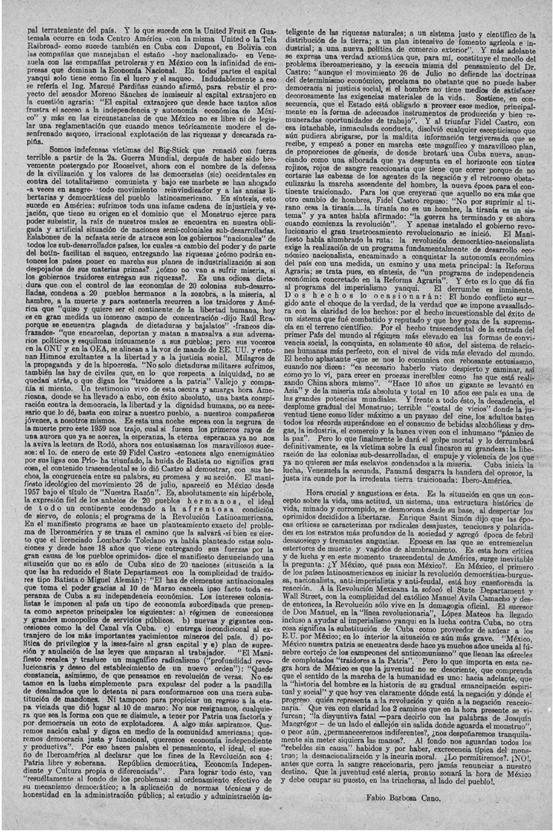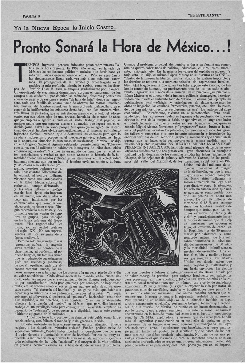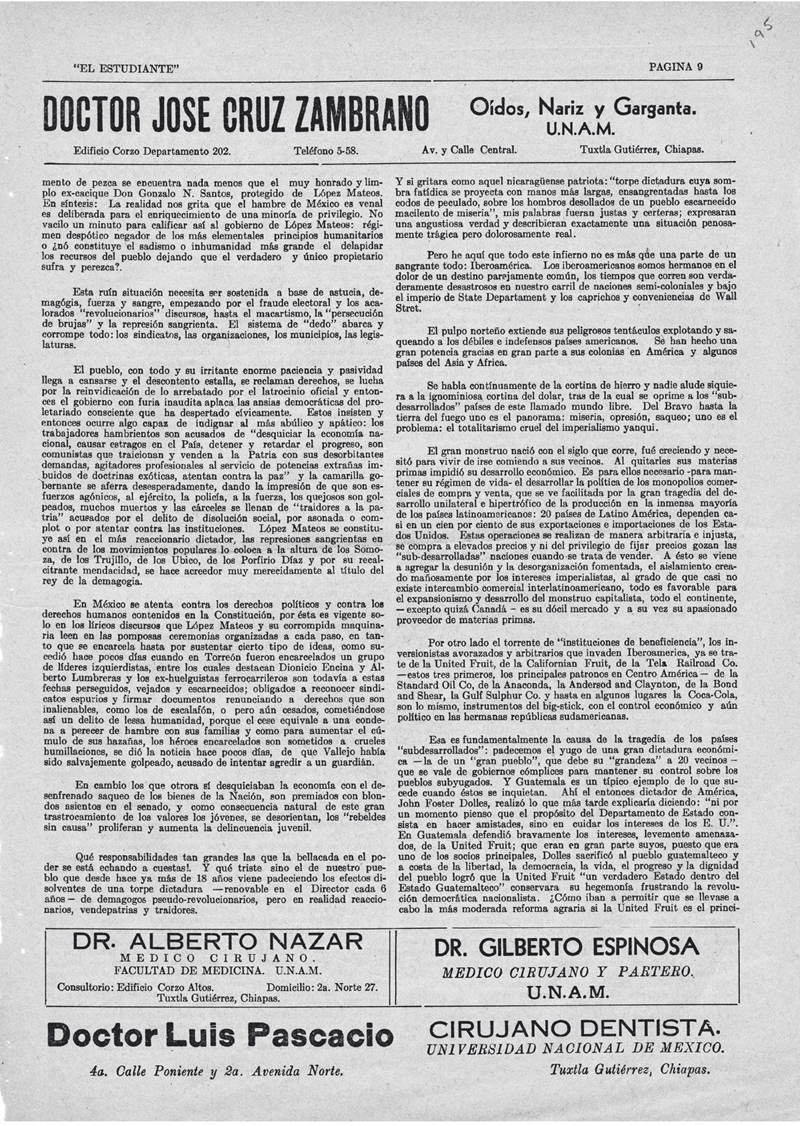 Aunque comparte con el anterior ciertos tópicos, el siguiente documento periodístico es mucho más extenso y está signado por Fabio Barbosa Cano desde una publicación de la preparatoria del Instituto de Ciencias y Artes de Chiapas (ICACH), dirigida por quien fue uno de los periodistas de más amplia trayectoria en Chiapas, Carlos Ruiseñor Esquinca. La desigualdad en México, productora de pobreza y con permanencias medievales, es interpretada con claros tintes marxistas y se ejemplifica con el vivir de indígenas y a través de la “voz de la burguesía”, representante de los enriquecidos mexicanos. Junto a estas afirmaciones, resumidas aquí, se encuentran referencias a la condición de los emigrantes mexicanos en Estados Unidos y los males del sistema político, ya puesto en duda por su corrupción y coincidente con la efervescencia sindical de la época. Junto a ello el autor expresa, como lo hizo Froilán Esquinca, un pensamiento proiberoamericano que encuentra en el vecino del norte y sus empresas la antítesis al crecimiento independiente de los países y a la anhelada hermandad de Iberoamérica. Un desolador panorama para la América Latina deseada y que, como ocurrió con la Revolución mexicana, encontraba en la contraposición de sustantivos opuestos la separación entre el pasado, representado por Fulgencio Batista, y el futuro ofrecido con la incipiente Revolución cubana gracias a sus propuestas nacionalistas en pos de una “Cuba nueva”. Estas referencias se adornan con las referencias a socialistas utópicos como Henri de Saint Simon y al papel de los jóvenes frente a la reacción, y donde la figura de Vicente Lombardo Toledano se erige como estandarte de la lucha en beneficio de los trabajadores.