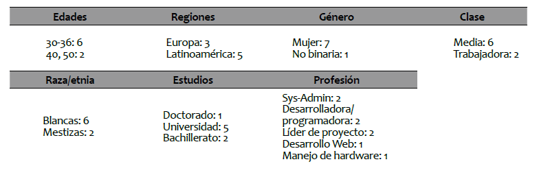 A partir de una primera exploración del campo, la cual se realizó desde finales de 2018 y a lo largo de todo el año 2019, fue posible el encuentro con mujeres desarrolladoras y sys-admin,14 quienes fueron las primeras interlocutoras que posteriormente me fueron conectando con otras más. Así es como hasta el momento de la elaboración de este artículo he logrado acercarme a y entrevistar a ocho mujeres hacker de diversas latitudes, edades y condiciones sociales.