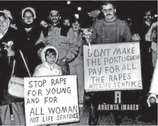 Mi involucramiento con el estudio de las migraciones internacionales empezó cuando fui contratada en 1987 como profesora visitante de Estudios Portugueses de la Universidad de Massachusetts Dartmouth. Esta cátedra fue creada en respuesta a las constantes demandas de líderes lusoamericanos que postulaban la necesidad de impulsar investigaciones de docentes y estudiantes sobre los portugueses y sus descendientes radicados en las pequeñas ciudades de la costa sur de Massachusetts, localizadas a su alrededor, como Fall River, New Bedford y Tauton. Estas reivindicaciones se intensificaron con el incremento de la discriminación y xenofobia provocadas por un célebre caso de violación tumultuaria ocurrido en 1983 en una taberna ubicada en un barrio obrero portugués de New Bedford, cuyos protagonistas (víctima, acusados del estupro y fiscalía) eran inmigrantes portugueses o descendientes de tercera generación. Difundido por los medios de comunicación, incluido un juicio televisado, este caso, conocido como Big Dan y reproducido con imágenes (véase foto 1), llevó a un aumento de la discriminación contra los inmigrantes portugueses en la ciudad y la región.