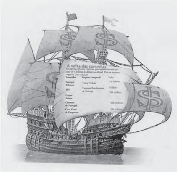 El segundo suceso -retratado por los medios brasileños como el regreso de las carabelas (véase figura 2)- permitió, por su parte, revisar las disputas y reconstrucciones de la portugalidad entre los liderazgos portugueses y lusobrasileños de São Paulo a finales de la década de los noventa, en un contexto de inversiones del movimiento de capitales de Portugal hacia Brasil y de creciente convergencia entre las políticas de la (alta) cultura portuguesa y las de mercado e inversión.