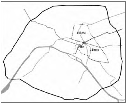 Así, el objetivo del artículo es demostrar que la caminata urbana se realiza de manera diferente según los ritmos urbanos de la ciudad, lo que implica un cambio en el acoplamiento del régimen utilitario (caminata de desplazamiento) con el régimen lúdico (caminata de deambulación). Así, se configuran otras modalidades de la relación con la ciudad y con los otros, generando una experiencia urbana del espacio público que va del anonimato al uso desenvuelto y familiar de dicho espacio. El estudio exploratorio-descriptivo de la calle Faubourg du Temple, de la ciudad de París,4 permite profundizar en dicha hipótesis. Para ello, se utilizan diferentes técnicas de investigación como la observación directa, las encuestas flash y el seguimiento de personas; la intención es aprehender la caminata urbana durante la noche en cuanto experiencia sensible.