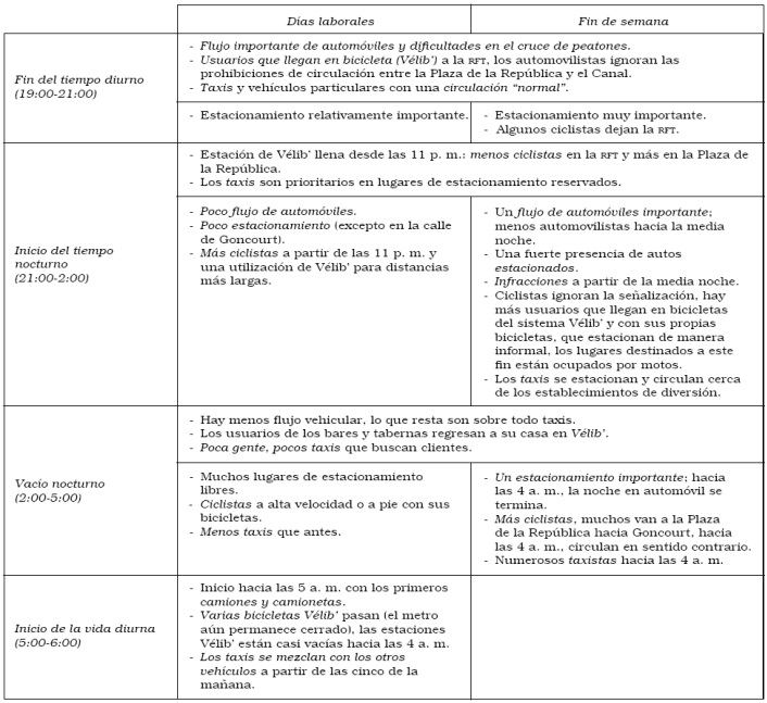 Las temporalidades nocturnas que se identificaron son menos marcadas el fin de semana, el inicio del tiempo diurno y la intensificación es de nueve de la noche hasta las tres de la mañana, y el vacío nocturno es más reducido entre las tres y las cinco de la mañana.