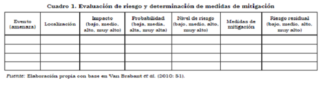 Al seleccionar medidas adecuadas de mitigación se reduce automáticamente la vulnerabilidad frente a la amenaza y, por lo tanto, el riesgo (ECHO, 2004: 11). Por ello, una vez que se han escogido las medidas de mitigación, es una buena práctica volver a estimar el nivel de riesgo. Esto se conoce como riesgo residual (Van Brabant et al., 2010: 50), el cual se anotará en la última columna del cuadro 1.