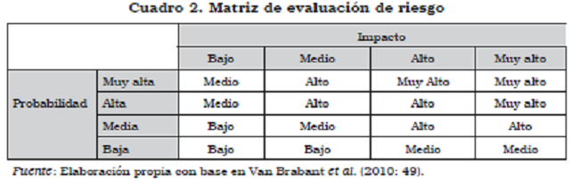 En la quinta columna debe estimarse el nivel de riesgo, el cual es una expresión de la vulnerabilidad hacia una amenaza determinada. Para evaluarlo, puede consultarse la matriz en el cuadro 2, donde se cruzan, por un lado, el nivel del impacto y, por el otro, la probabilidad de ocurrencia del evento. La combinación de estos valores establece el nivel de riesgo.