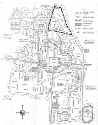 No hay letrero que anuncie “Bienvenido a Tepito”, el barrio que ha vivido más de cinco siglos la historia de la Ciudad de México.4 Se sitúa a un kilómetro del centro de los poderes político y religioso del país, y es considerado como “el mercado informal más grande de América Latina” por Alfonso Hernández, el cronista del barrio, y por integrantes de la Cámara de Comercio de la Ciudad de México.5 Tepito ha experimentado una dinámica comercial donde legalidad e ilegalidad son puntos difusos. Desde sus inicios como asentamiento urbano, este espacio figuró como un barrio marginal de Tlatelolco, ciudad gemela de la gran Tenochtitlan (véase mapa 1). Ambas localidades, con una población entre 150 mil y 200 mil habitantes, ya entonces eran catalogadas como unas de las ciudades más grandes del mundo durante este periodo (Hardoy, 1994: 12; Wildner, 2005: 43). A través de calzadas flotantes en la zona lacustre, múltiples mercancías llegaban a Tlatelolco, aunque varias de ellas se vendían a menor precio en Tepito. Se dice que, debido a la falta de controles, otra razón de los costos accesibles se derivaba de ofrecer cosas robadas (Enríquez Fuentes, 2010: 131).