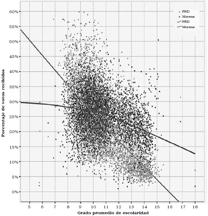 La regresión lineal muestra que el comportamiento de los votantes hacia el PRD en dichas elecciones decae de manera sostenida, poniendo en evidencia que las personas con menor grado de estudios sufragaron por ese partido. En contraste, quienes lo hicieron por Morena manifiestan otro comportamiento. La votación hacia ese partido decae ligeramente de 30 a 25% hasta los 11 años de escolaridad (preparatoria). A partir de ese momento, comienza a disminuir hasta un promedio de 18% de votos recibidos asociados a 14 años de educación. Lo anterior indica que la votación hacia Morena está más dispersa entre la población.
