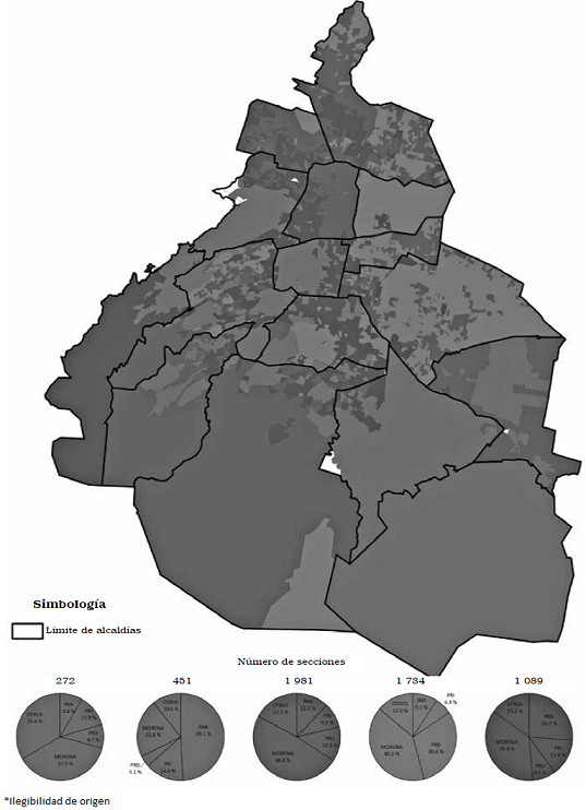 En el transcurso del artículo varios de los procesos políticos descritos están cruzados por la influencia de las redes territoriales de carácter político-clientelar -en particular en zonas con bajo índice de desarrollo social-, las que influyeron en los resultados electorales. Pero, en otros, fue evidente que la vinculación electoral entre el PAN y el PRD en la propuesta para jefatura de Gobierno generó rechazo entre los votantes. El Mapa 1 revela que las preferencias electorales tradicionales se mantuvieron y en las secciones electorales panistas este partido conservó la mayoría de votos para candidatos a alcaldes. Por su parte, quienes habían votado por el PRD lo hicieron mayoritariamente por Morena, salvo en la alcaldía de Coyoacán. Un grupo político ha convertido a esa demarcación en su botín, malversando recursos públicos dirigidos a la reconstrucción de los inmuebles dañados por el sismo de 2017 e incitando la corrupción ha logrado mantener el favor de un sector del electorado.