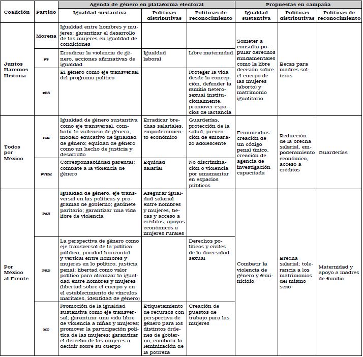 Como se mencionó, las agendas de género se reconstruirán mediante el análisis de las plataformas electorales de las principales fuerzas políticas del país (Movimiento de Regeneración Nacional [Morena], PRI y PAN) y de un seguimiento mediático de la campaña electoral de los candidatos. En el caso de las plataformas electorales, todos los partidos políticos, con excepción del Partido Verde Ecologista de México (PVEM), consideran la equidad de género como un objetivo importante. Con sus respectivos matices, postulan que este rubro es un eje sobre el que debe trabajarse con políticas públicas particulares, por lo tanto, ningún candidato pudo eludir los temas de género. Pero, como se expondrá, sus propuestas están ancladas en una visión esencialista de los sujetos.