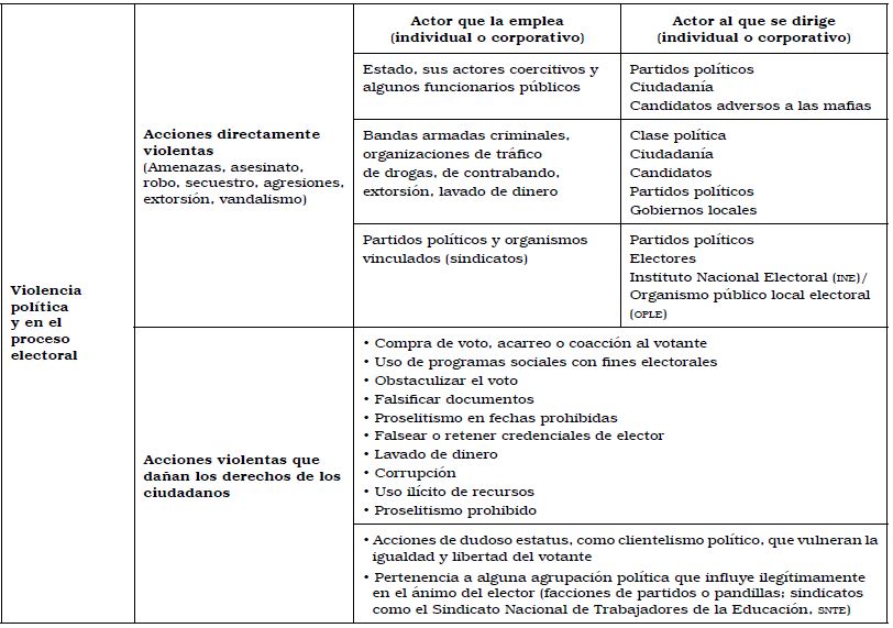 En suma, la violencia electoral forma parte de la violencia política, pero se distingue de ella porque se localiza dentro de un contexto electoral en el que distintos actores y la sociedad civil compiten por obtener una cierta cantidad de cargos y recursos públicos; porque su motivación e instrumentos son precisamente electorales. Una concepción amplia de la VP que incluya la VE debe tener en cuenta que: 1) puede ser ejercida por actores estatales y no estatales; entre ellos, las élites políticas locales son centrales en este juego político y su manejo de los recursos públicos y coercitivos; 2) es posible clasificarla en formas interpersonales o colectivas; 3) tiene destinatarios, principalmente autoridades o instituciones públicas (aunque puede estar dirigida contra los ciudadanos); y 4) pretende alterar su constitución, capacidad representativa, funcionamiento o capturar los bienes públicos para beneficio privado, además de alterar las políticas públicas. La VP puede ser empleada durante las elecciones, pero también en otros periodos. No obstante, el vínculo entre VP y elecciones provoca cuestionamientos acerca de sus efectos en los procesos democráticos. La VP incluye el uso de la fuerza física y/o psicológica utilizada “con el propósito de modificar el comportamiento de los actores” (Nieburg, 1969) de manera legal, ilícita o ilegítima, así como para alterar los resultados electorales o la integración de los gobiernos, de forma tal que producen un daño a los competidores, a las instituciones públicas y a la democracia. Asociados con la VE se encuentran los actos que constituyen delitos electorales sancionados por la legislación;6 estas transgresiones, si bien pueden no ser violentas, influyen en los resultados de los comicios.