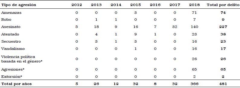 La búsqueda realizada registró un total de 481 eventos entre 2012 y 2018; sin embargo, los actos transgresivos se elevan a 502 debido a que en varias ocasiones tuvo lugar más de una acción violenta y/o delito electoral en un mismo evento. El año 2018 concentra la mayoría de los casos entre otras cosas por la magnitud del proceso electoral. La tendencia de estos años marca que las agresiones van al alza, lo cual confirma nuestro argumento de que la VP sigue siendo un comportamiento concurrente en nuestras elecciones.