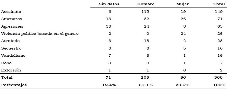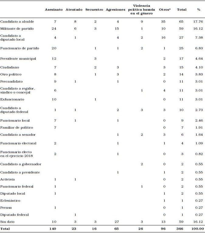 La VE es un fenómeno que persiste en los comicios del país y ha ido en aumento desde 2012, contrario a lo que se esperaría del proceso de democratización. Además, en 2018 se registraron 366 casos de acciones violentas; incluidos 140 asesinatos (de un total de 227 en el periodo 2012-2018); 71 amenazas y 45 agresiones a candidatos, funcionarios militantes de partido o ciudadanos, sobre todo varones. La mayoría de los hechos están concentrados en el ámbito local (contra candidatos a alcaldías, a diputaciones estatales y presidentes municipales) y en funcionarios y militantes de partido donde se celebraban elecciones concurrentes de gobernador, de congreso estatal y de presidente de la república. En sitios con elecciones concurrentes se dio la mayor cantidad de asesinatos. En cuanto a los partidos políticos, Morena fue el que sufrió un mayor número de actos de violencia, con 101 registros, seguido del PRI con 62 y el PRD con 60. Empero, el PRI fue el que más homicidios experimentó (32 casos), seguido del PRD con 27 y Morena con 23.