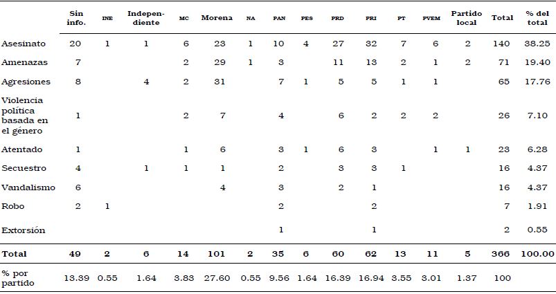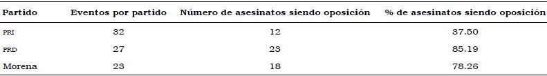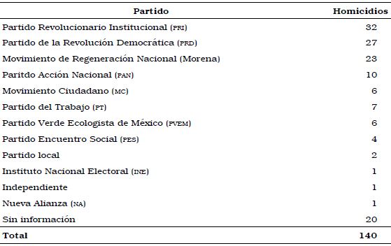 Los datos ponen de manifiesto que la violencia afectó a todos los partidos porque perdieron algunos de sus integrantes en un homicidio; también ocurrió que se renunciara a la candidatura después de sufrir una agresión o que hayan sido derrotados. El PRI, el PRD y Morena aglutinan poco más de 50% de los casos.